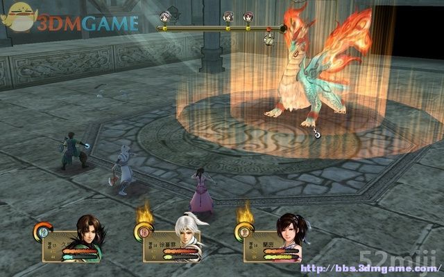 在庙宇中调查一幅石雕壁画,上面讲述乘龙飞天的故事,兰茵望着壁画满脸忧郁,似乎有什么心事。就在暮云询问之际,一只青龙幻兽突然出现在面前。这只幻兽在开始的实力很普通,将血打空后会变身增大,这时才是战斗的真正开始。幻兽会不时用“爆空漫焚”群体攻击,并且单体攻击的“神龙之吼”能将满血的队员打至濒死状态,治疗务须及时。当它掉半血的时候会使用蓄势攻击的“聚灵天啸”,它只会打前排,这时要及时换位躲闪。