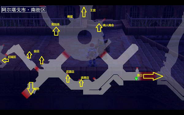 整个阿尔塔戈市不是很复杂,具体如下图。上层为竞技场和王宫区,下层则是商业和港口区。地图西部是旧城区,南部的出口则是城外