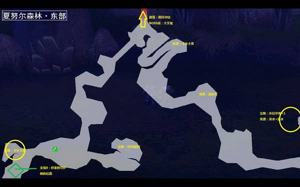 从东南平原的出口即可到达夏努尔森林。整个夏努尔森林的地图仍然比较简单,具体可见地图标注