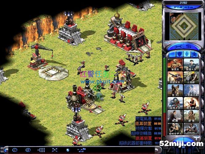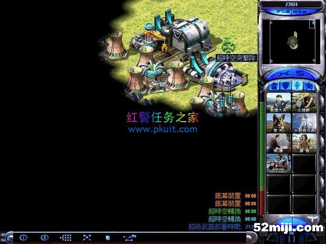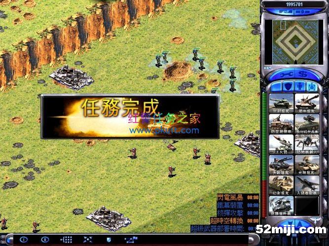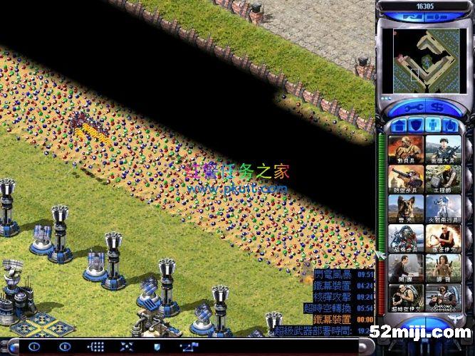 出了超时空突击队后速度派到除了红色的基地外其他的基地,每个基地有三个电脑,小心摧毁。注意光菱,摧毁下面的两个建造厂可以在光菱打到你之前躲开的,就注意三个电脑就都归顺了我方。然后触发刷出了一些三级飞行兵和三级天启。嘿嘿。不过摧毁基地后就都变成我方的了