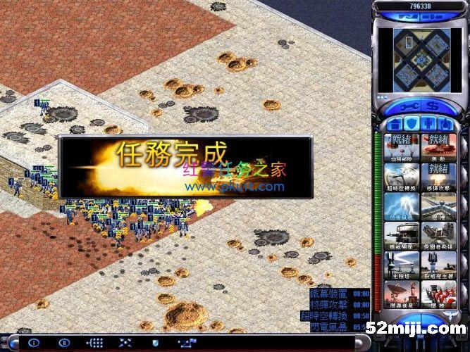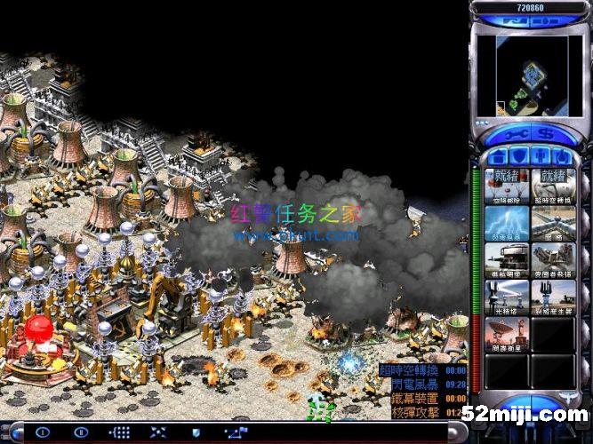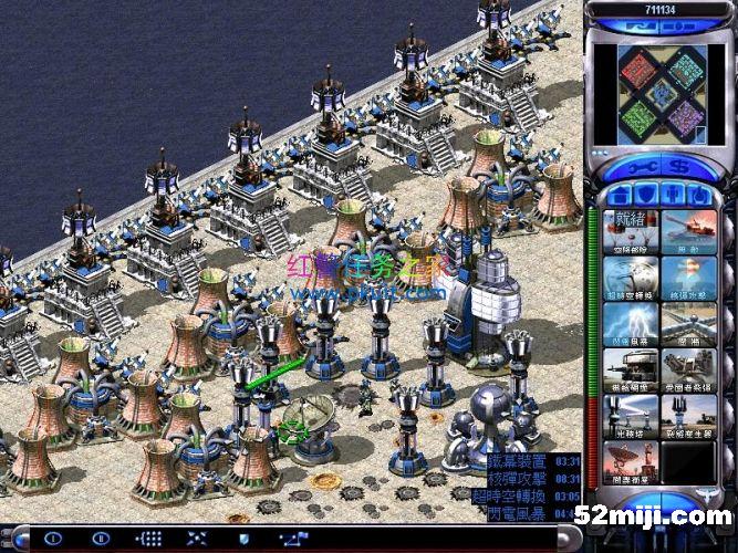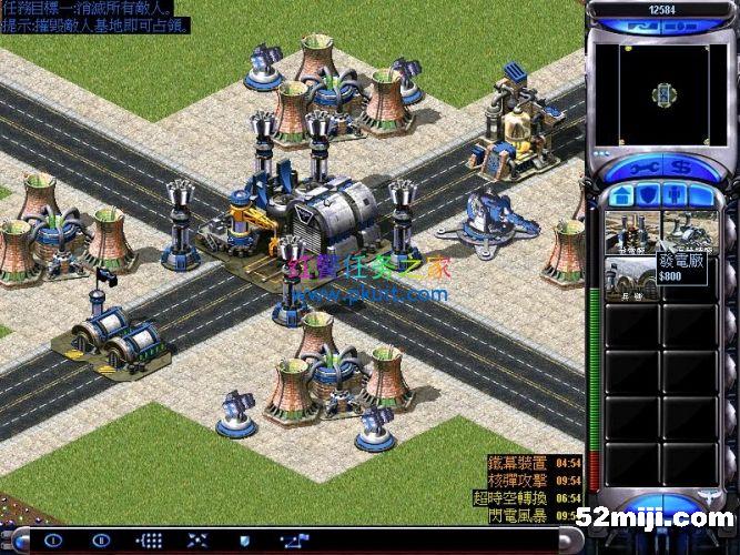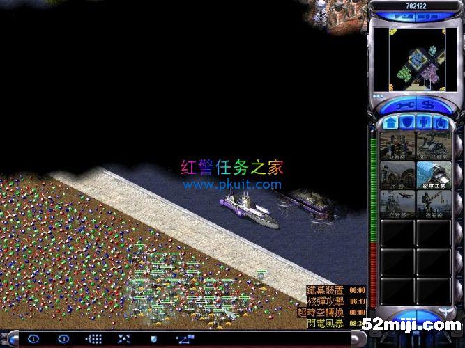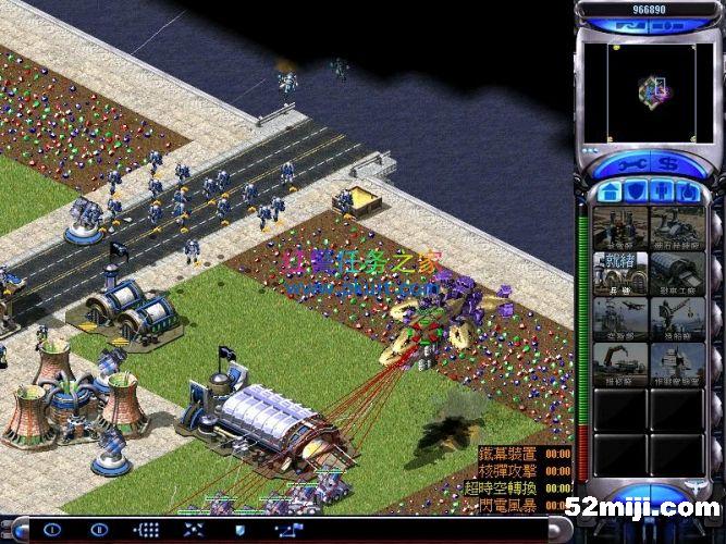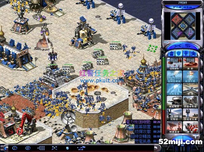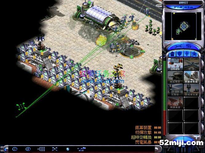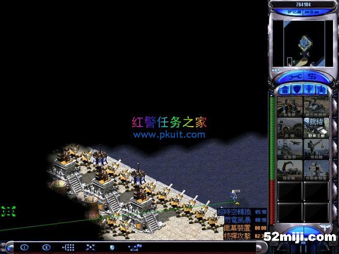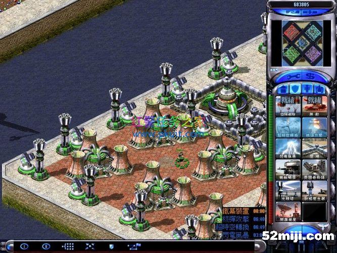间谍编好队,丢个闪电摧毁一个建筑后间谍速度变身。载入防空车超时空传送到这里等候,等我方飞行兵再次从两个电脑的中间穿过来在下面集合时,就断电,飞行兵速度来摧毁这里的苏军建造厂归顺我方