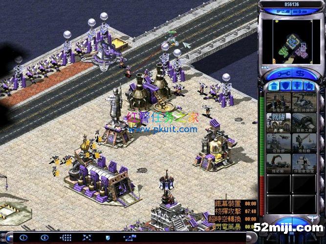 然后拉到这个中立的盟军基地这里来,玛雅金字塔只能打到一部分,还有一部分八个光菱塔的攻击又合在了一起,最多一次灭两三个突击队,然后等能动了就速度炸了建造厂归顺我方。屏幕就全黑了。可能一次成功不了,多试几次就OK。