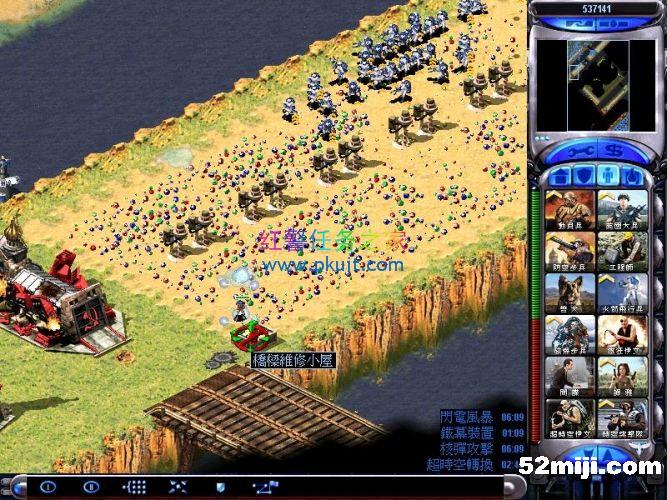 出了飞行兵压力勉强的小了点,主要还是因为没钱,这里没有任何的触发,开始防御好后出些大兵过桥去摧毁磁爆线圈与防空炮,这里的维修工厂和下面桥那里的重工可以占领出苏军移动基地车,不过被我不小心维修工厂给灭了