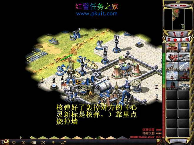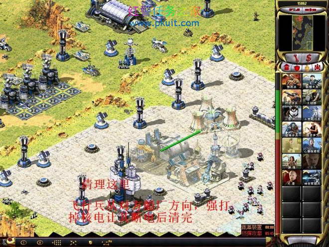 开始就用给的直升机打掉科技修理厂旁边的幻影。占领后速攀科技。 大桥高地上放点飞行兵(对方飞行兵和飞艇转折点)高地断桥处放几个幻影。基地后方也放几个幻影,放个没用建筑吸引攻击。沿岸出点防空。第一次敌方空降可以用尤理改的D键技能全部杀死,海里的部队也俘虏了(就是让它自相残杀)。直升机贴上边飞占领间谍卫星。核弹轰掉对方核弹(心灵控制器)烧掉墙,超时空兵上去灭掉基地。飞行兵从间谍卫星方向近来达掉两个核电对方断电随便杀。